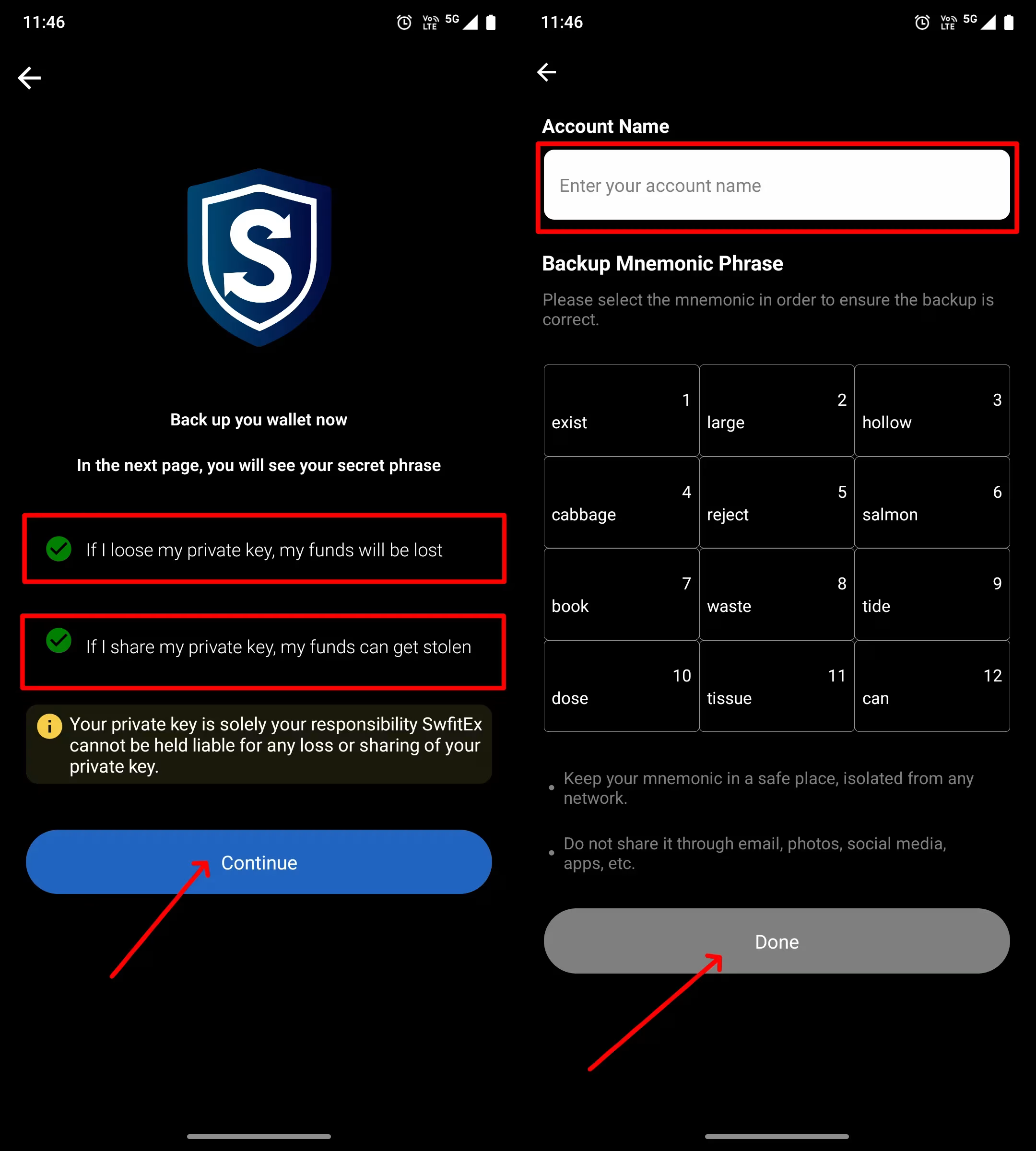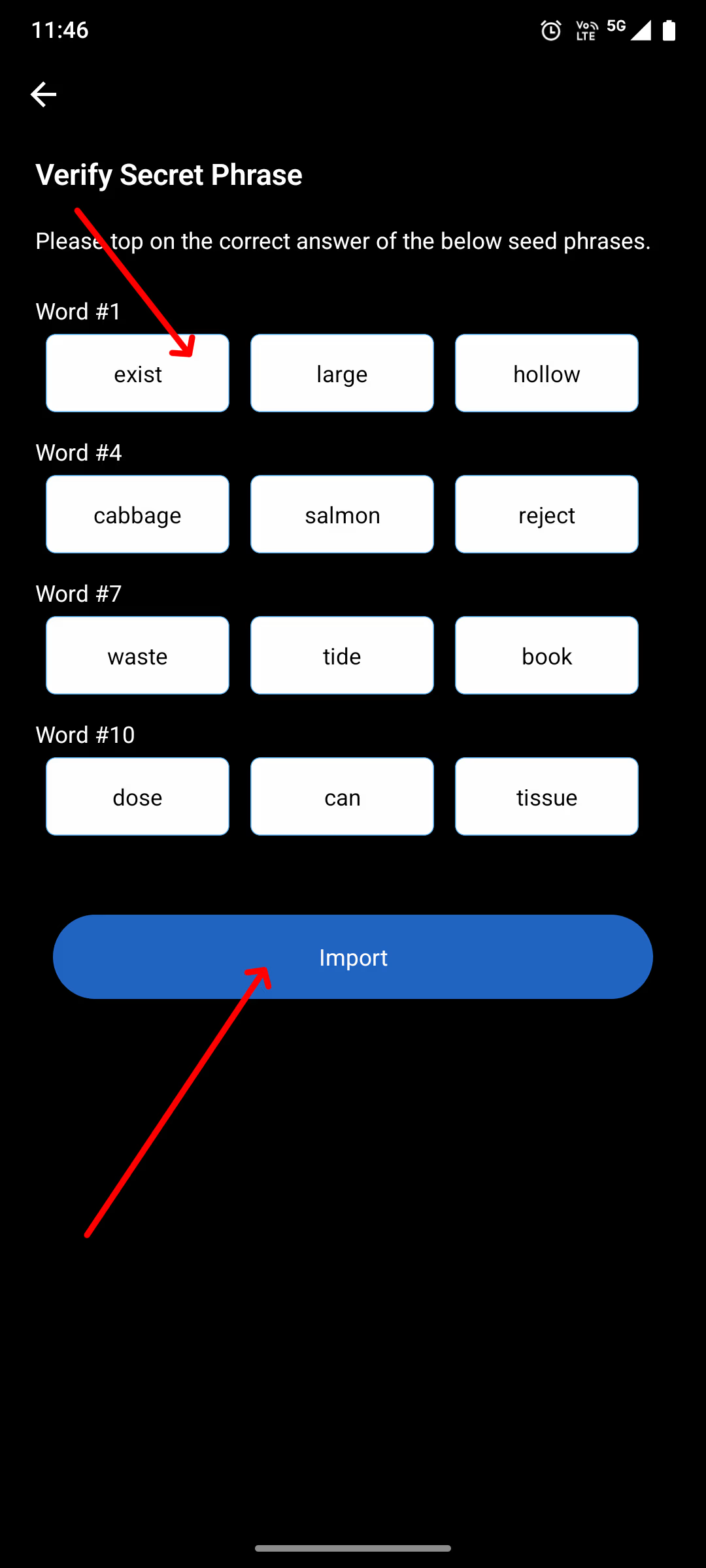 Next, you’ll be asked to verify your recovery phrase by entering the words in the correct order. This step ensures that you’ve saved the phrase properly and helps prevent accidental loss of access.