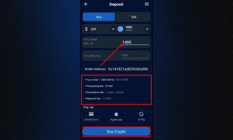 Enter the fiat amount you wish to spend. The app will automatically calculate the equivalent USDC amount in real time, reflecting the most current market rates.