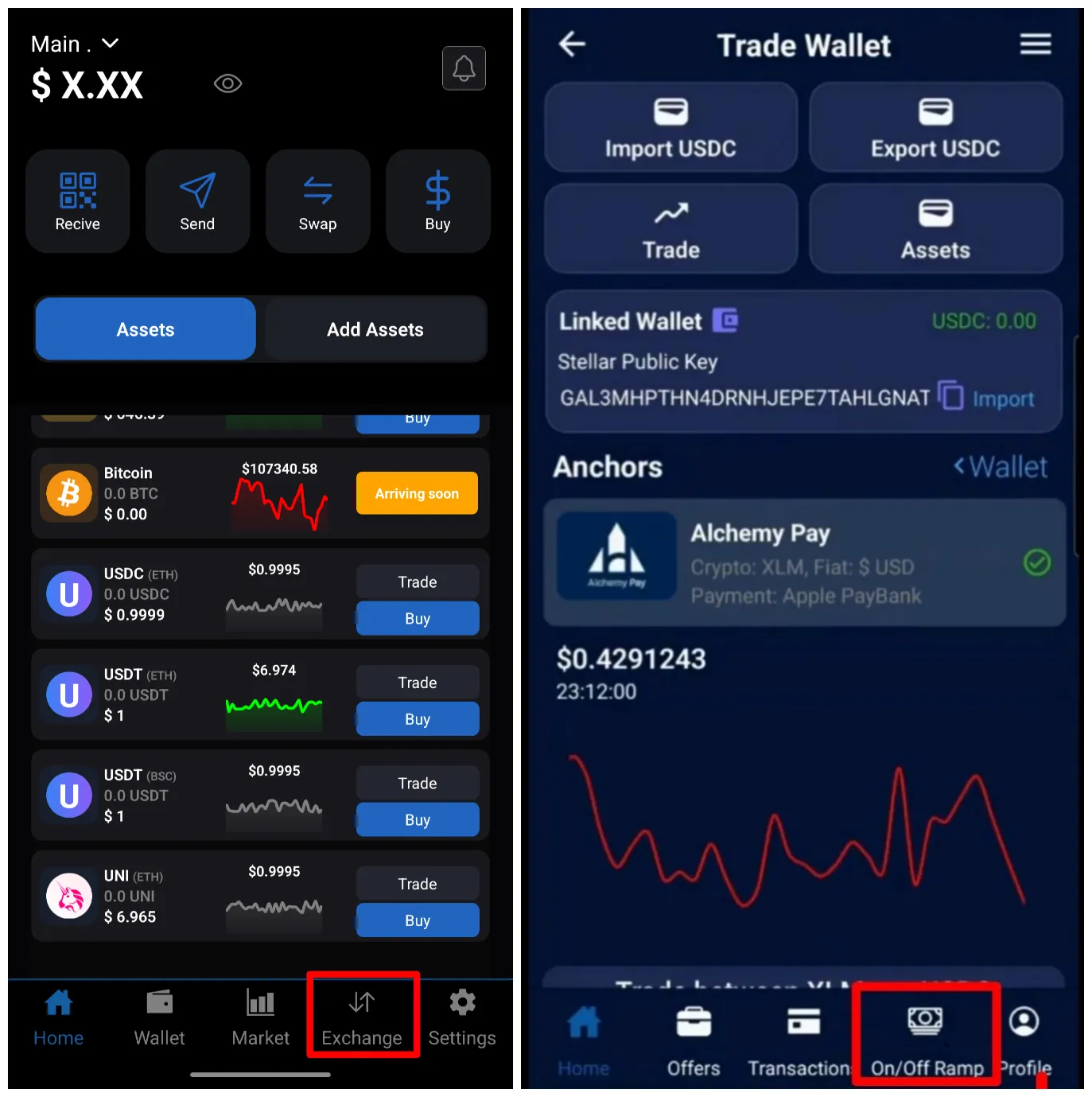 To begin, open the SwiftEx App and navigate to the Exchange tab. From there, select the On/Off Ramp section. This is your gateway to converting fiat into crypto (on-ramp) or converting crypto back into fiat (off-ramp)