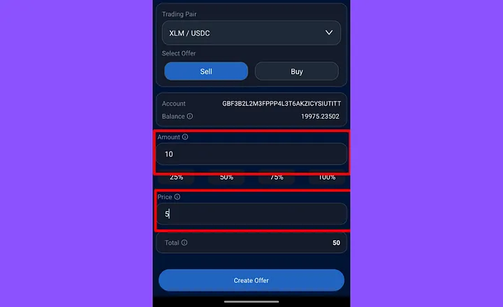 Tap ‘Create Offer’ to submit your custom trade. Your offer will be promptly listed in the order book and will remain active until it is fully filled, modified, or you manually cancel it.