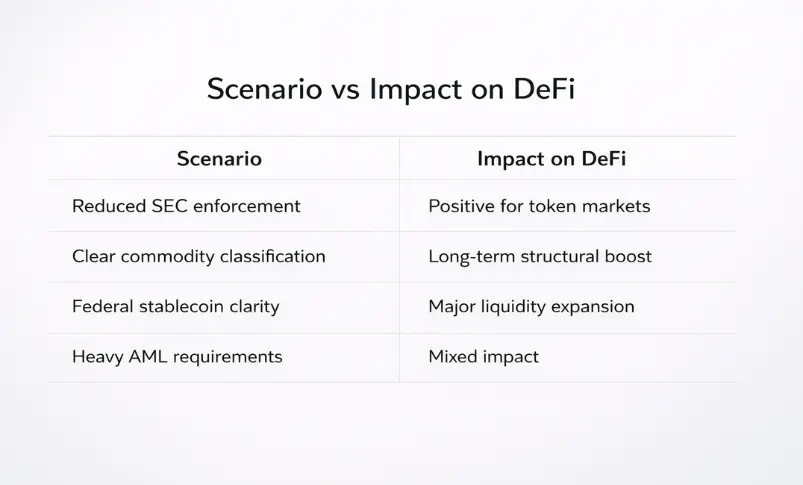 DeFi TVL (Total Value Locked) could rise under favorable regulatory signals.